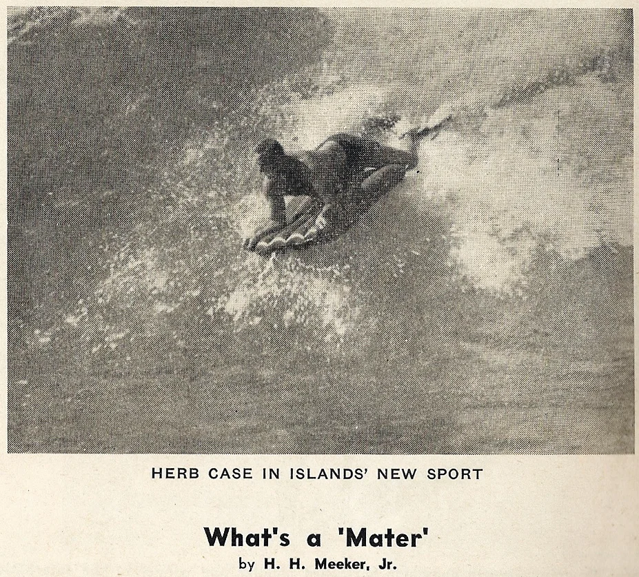 The official Souvenir Programme from the 1956 World Surfing Championships held at Makaha, Oahu, Hawaii. This wonderful bit of history features an article by H.H. Meeker entitled "What's a Mater?" That might sound a bit rude but we think he meant "matter" and it suggests that Mat Surfing is the "Island's New Sport".
